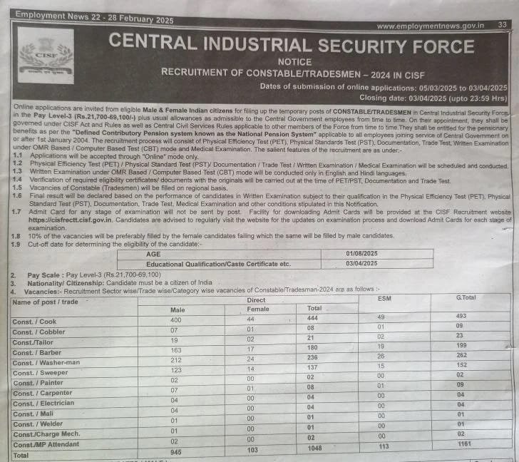 CISF Constable Tradesmen Recruitment 2025 : Vacancy Details