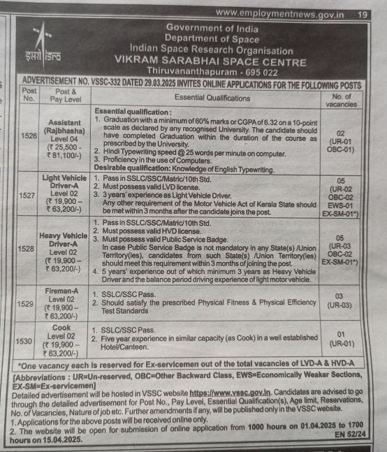 ISRO VSSC Assistant, Driver, Fireman & Cook Online Form 2025