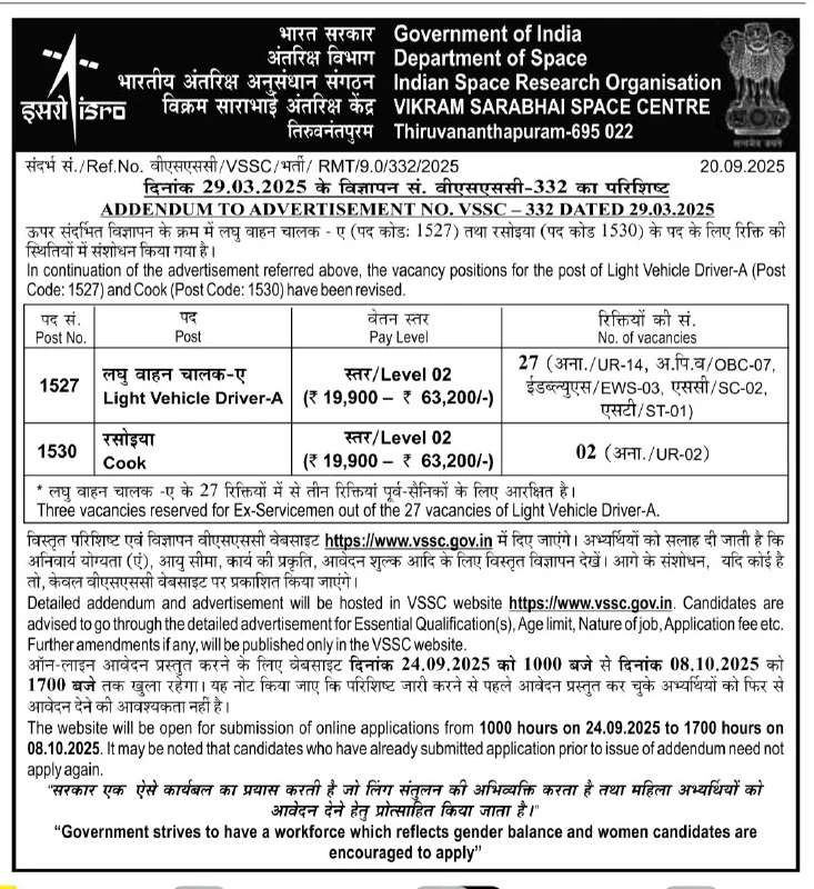 Indian Space Research Organization (ISRO) has released a notification on its official website for the recruitment of Assistant, Driver, Fireman & Cook posts. This recruitment is for 39 vacancies. The ISRO VSSC application form (Re-Opened) started on 24 September 2025, and candidates can apply until 08 October 2025. Candidates are advised to check complete details for the ISRO VSSC Assistant, Driver, Fireman & Cook Recruitment 2025 provided below.