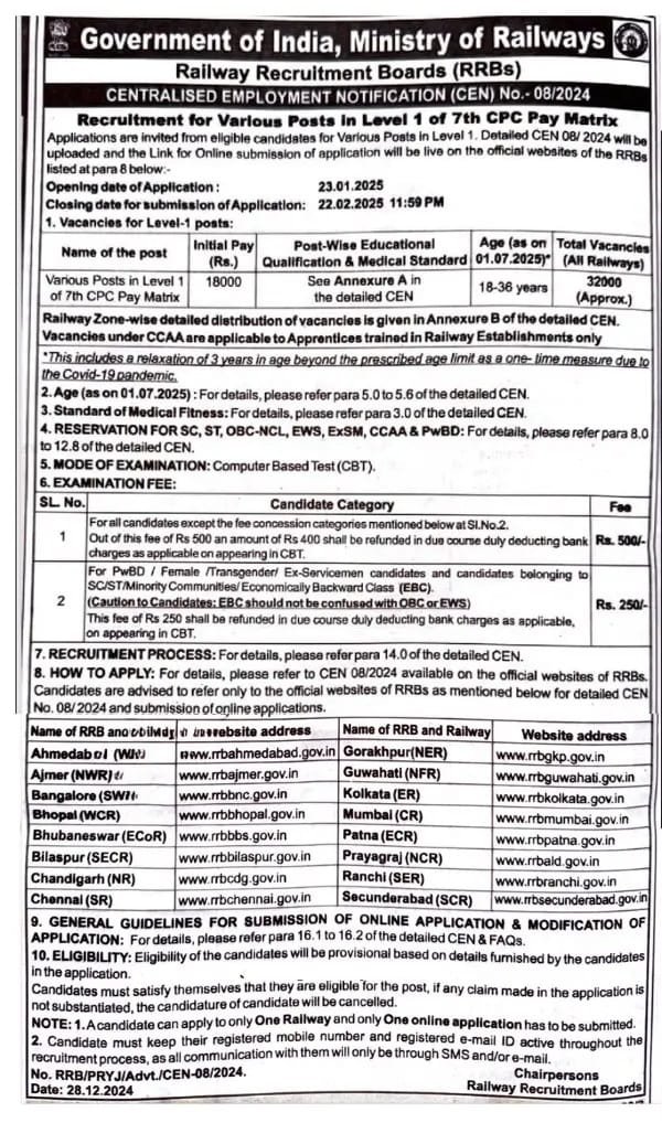 RRB Group D Examination 2024 | Advt. RRB CEN 08/2024 Brief Information