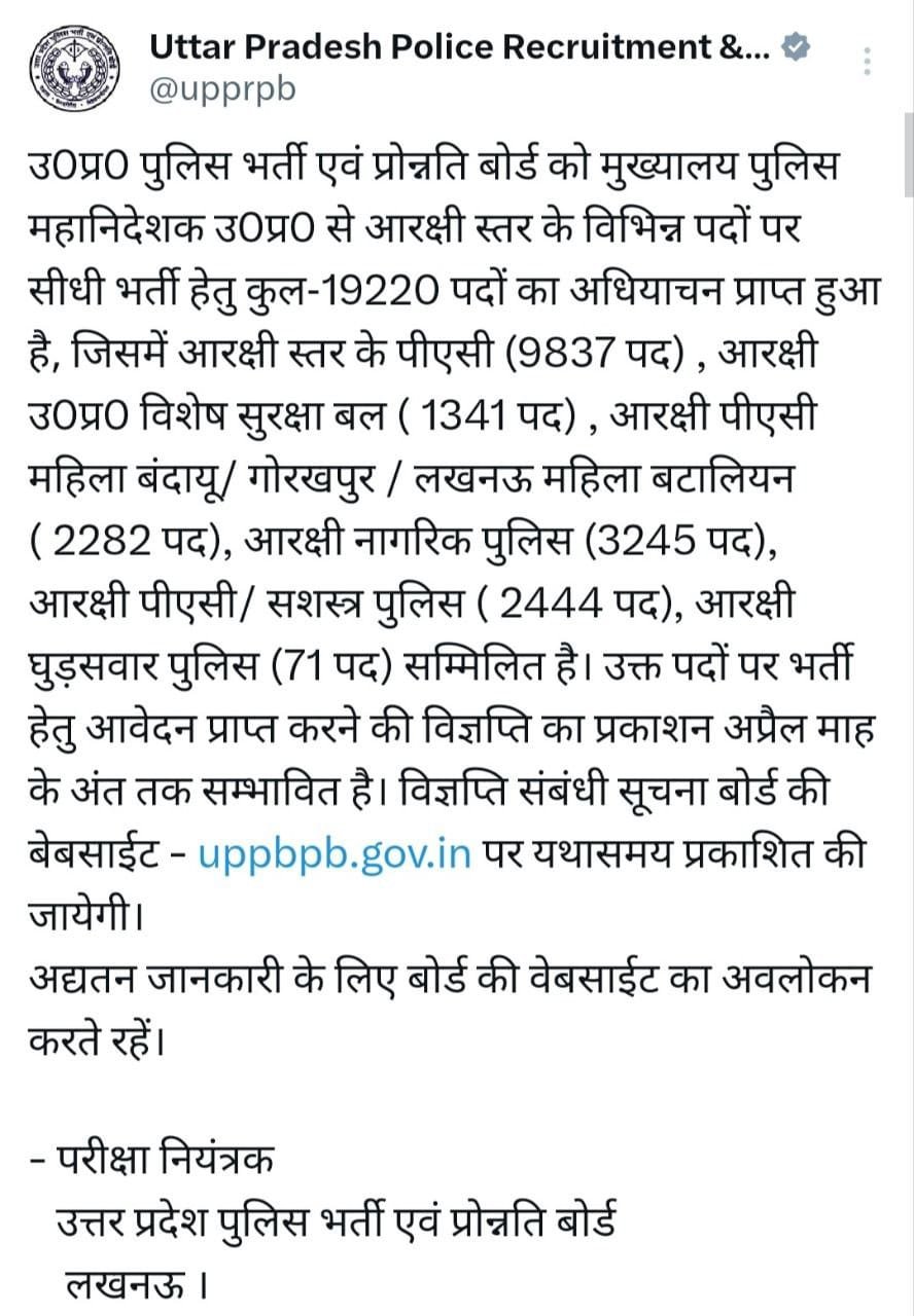 The Uttar Pradesh Police Recruitment and Promotion Board (UPPRPB) has received administrative approval for the recruitment of 19,220 Constable positions. The detailed official notification for this recruitment drive is anticipated to be released by end of April 2025. All prospective candidates are advised to monitor the Board’s official website, uppbpb.gov.in, regularly for the latest updates and the official advertisement.